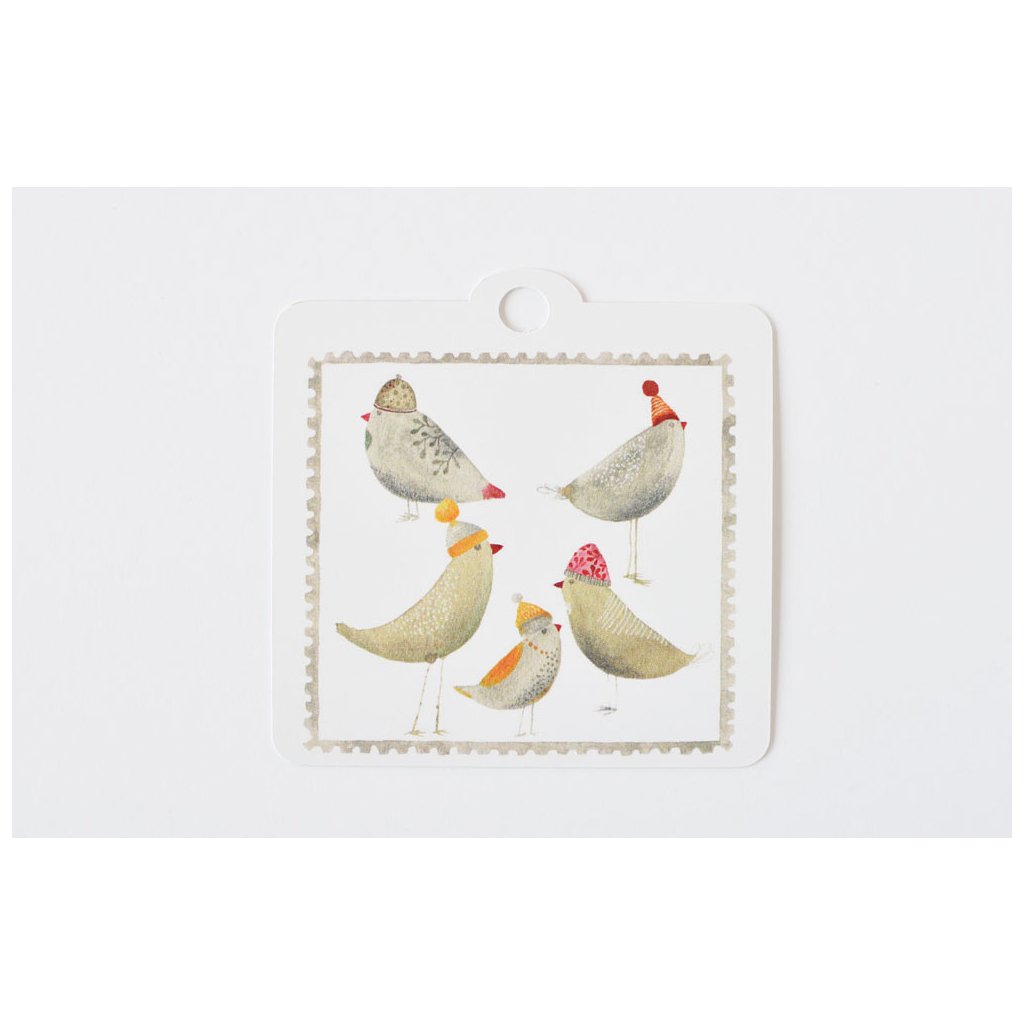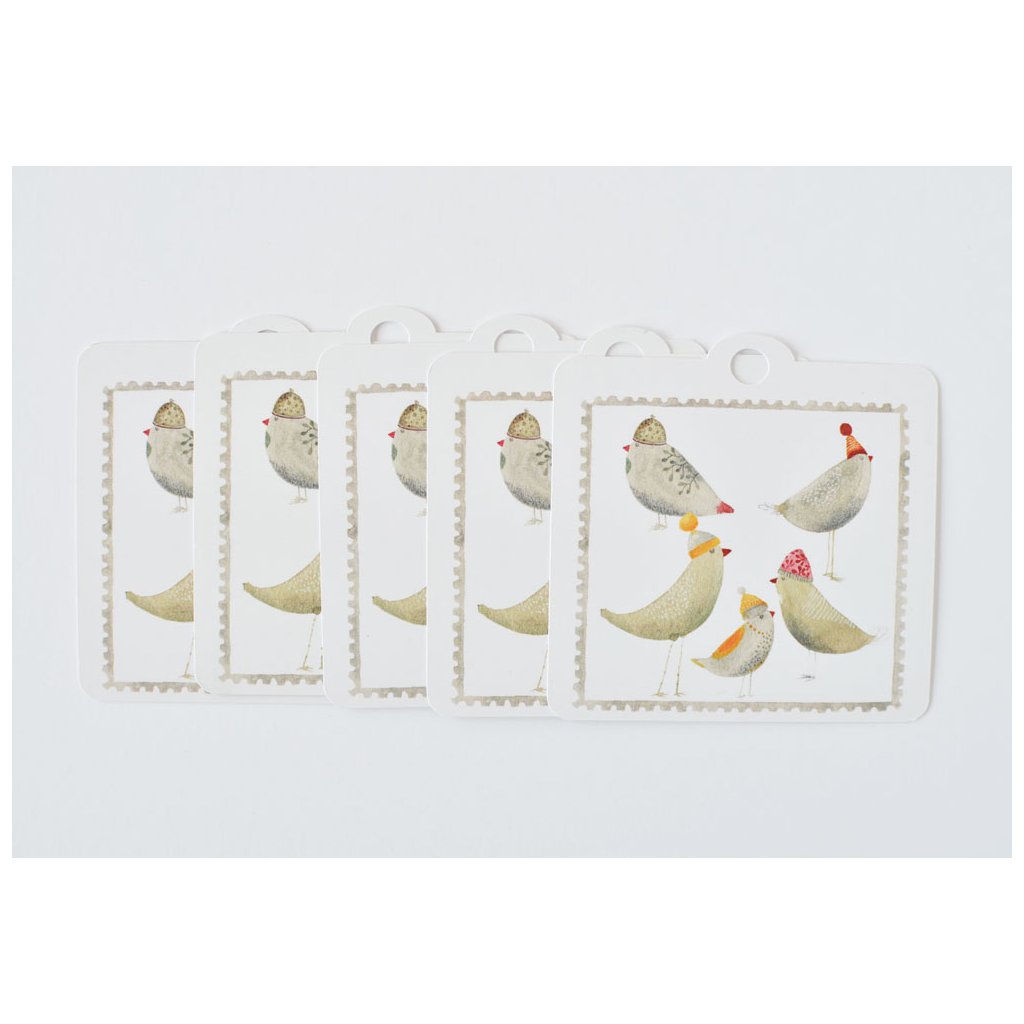 Pět stejných jmenovek na dárky s motivem ptáčků v kulichu.