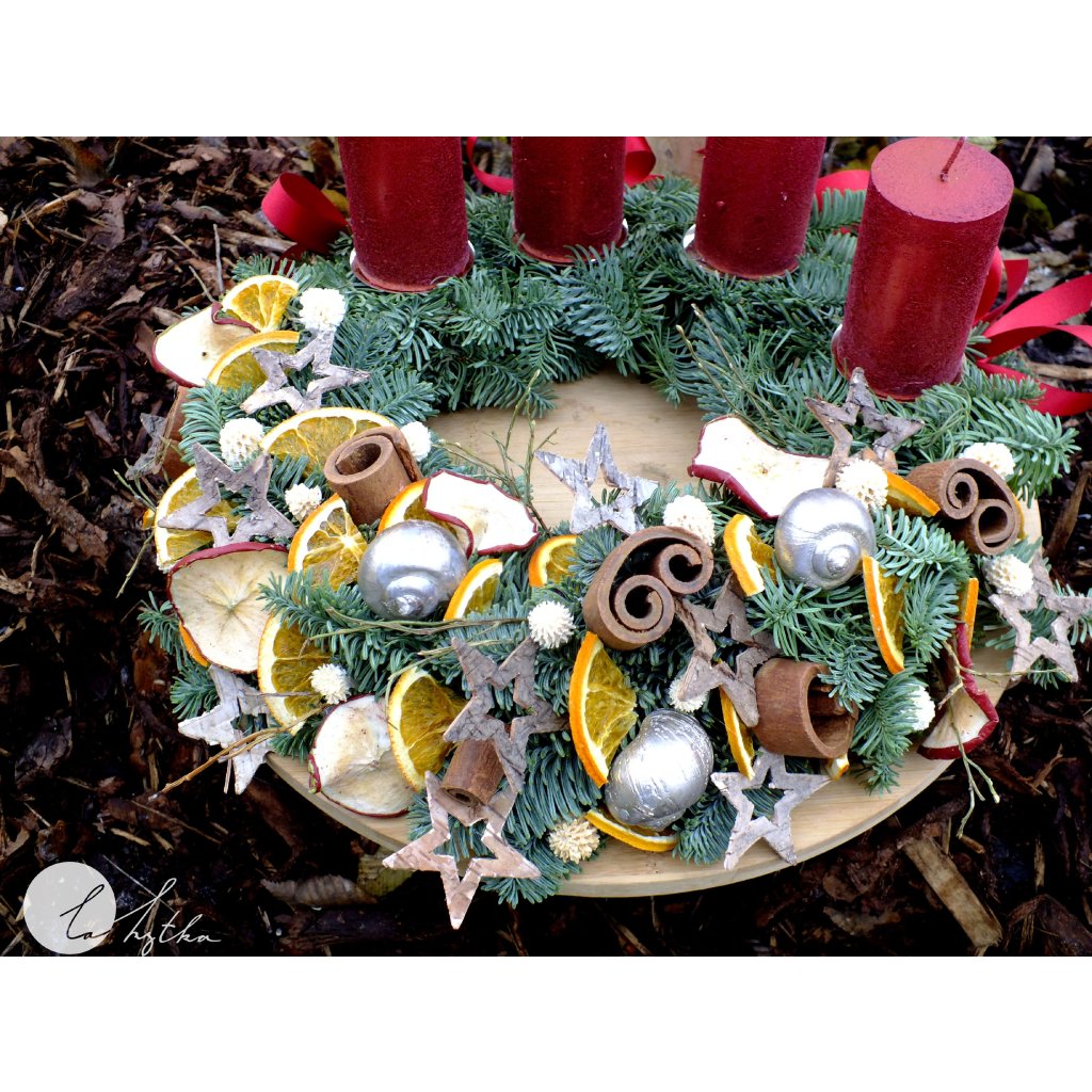 Věnec vázaný na slaměný korpus. Základem je chvojí z jedle nobilis.
