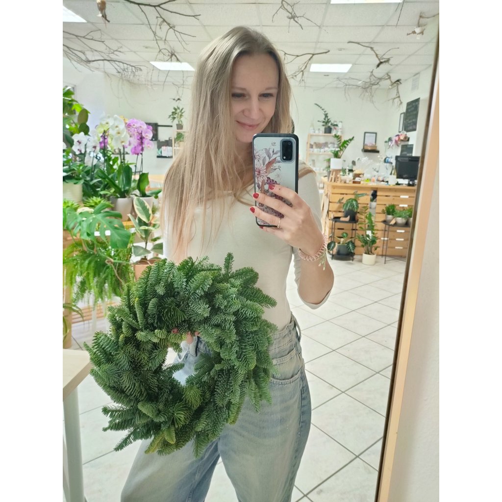 Věnec vázaný na slaměný korpus. Základem je chvojí z jedle nobilis.