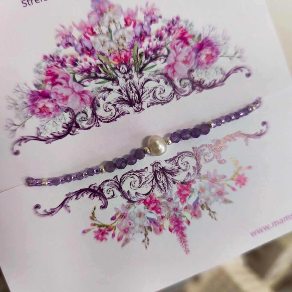 | Materiál: | říční perla, ametyst, pravé hedvábí |