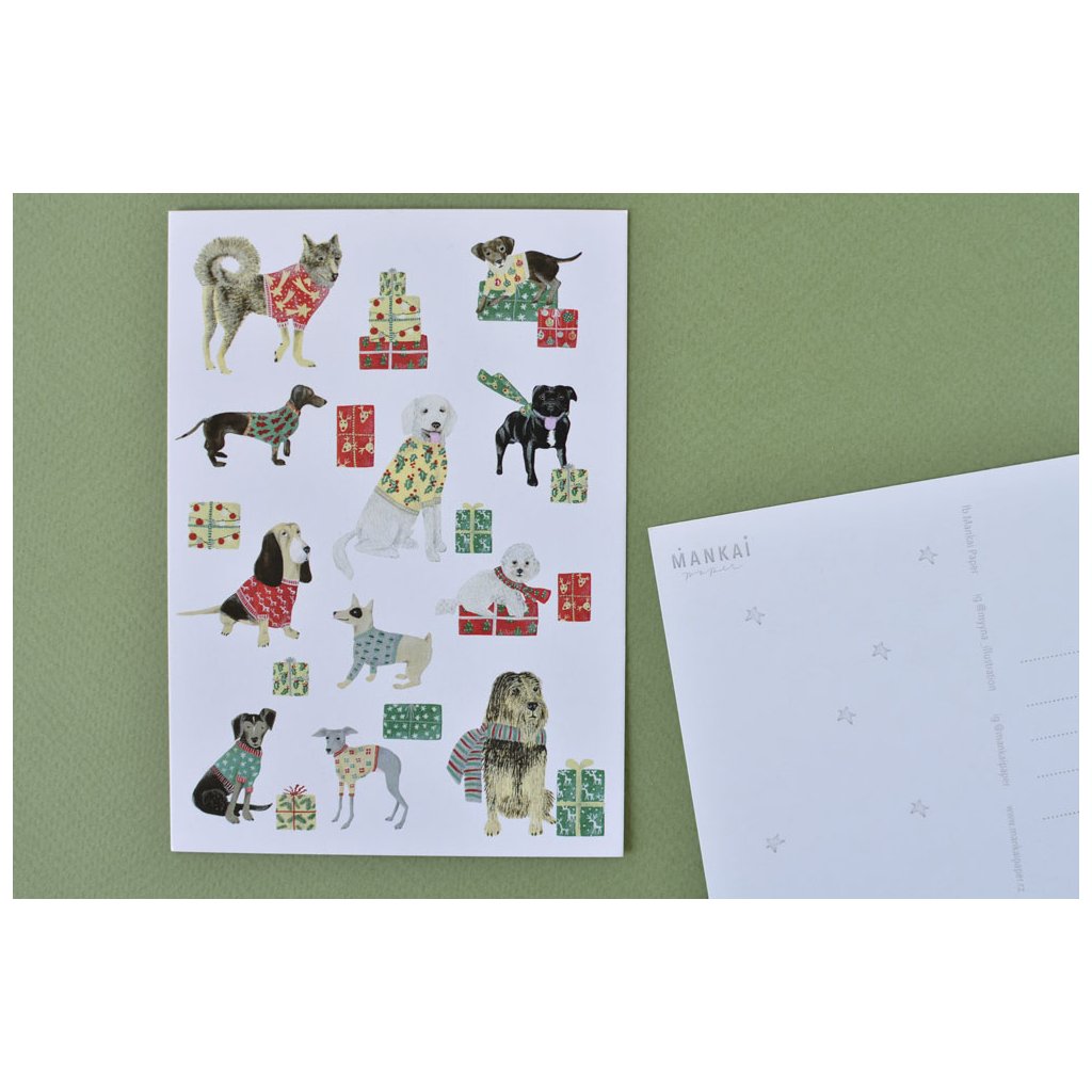 Vánoční pohlednice s pejsky ve vánočním oblečení.